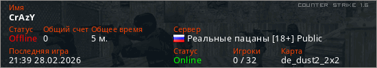 Играет на Counter Strike 1.6 сервере. Страна: РоссияПервый раз замечен 21:32 28.02.2026