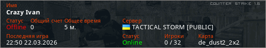 Играет на Counter Strike 1.6 сервере. Страна: УкраинаПервый раз замечен 22:15 22.03.2026