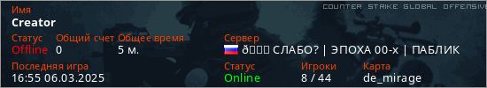 Играет на Counter Strike Global Offensive сервере. Страна: РоссияПервый раз замечен 16:51 06.03.2025