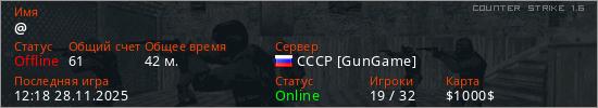 Играет на Counter Strike 1.6 сервере. Страна: РоссияПервый раз замечен 09:20 01.04.2024