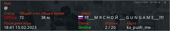 Играет на Counter Strike 1.6 сервере. Страна: РоссияПервый раз замечен 13:52 24.12.2022