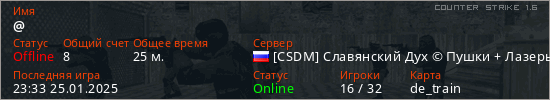 Играет на Counter Strike 1.6 сервере. Страна: РоссияПервый раз замечен 02:43 09.03.2024