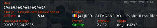 Играет на Counter Strike 1.6 сервере. Страна: РумынияПервый раз замечен 00:30 28.04.2025
