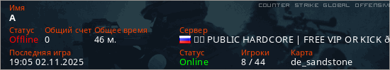 Играет на Counter Strike Global Offensive сервере. Страна: РоссияПервый раз замечен 22:36 27.08.2025