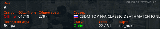 Играет на Counter Strike 1.6 сервере. Страна: РоссияПервый раз замечен 15:00 16.11.2019
