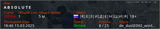 Играет на Counter Strike 1.6 сервере. Страна: РоссияПервый раз замечен 18:40 15.03.2025
