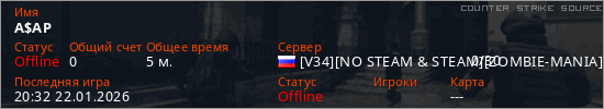 Играет на Counter Strike Source сервере. Страна: РоссияПервый раз замечен 20:15 22.01.2026