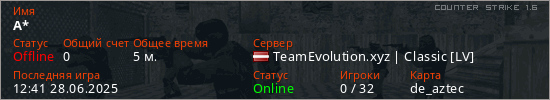 Играет на Counter Strike 1.6 сервере. Страна: ЛатвияПервый раз замечен 12:39 28.06.2025