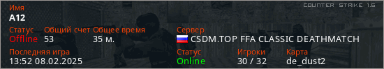 Играет на Counter Strike 1.6 сервере. Страна: РоссияПервый раз замечен 11:48 03.11.2024