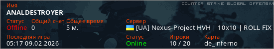 Играет на Counter Strike Global Offensive сервере. Страна: УкраинаПервый раз замечен 05:11 09.02.2026