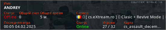 Играет на Counter Strike 1.6 сервере. Страна: РумынияПервый раз замечен 00:03 04.02.2025