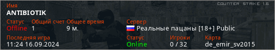 Играет на Counter Strike 1.6 сервере. Страна: РоссияПервый раз замечен 16:33 13.09.2024