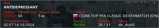 Играет на Counter Strike 1.6 сервере. Страна: РоссияПервый раз замечен 02:47 16.10.2024