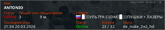 Играет на Counter Strike 1.6 сервере. Страна: РоссияПервый раз замечен 19:20 20.03.2026
