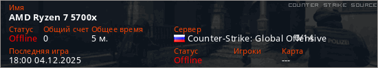 Играет на Counter Strike Source сервере. Страна: РоссияПервый раз замечен 17:23 04.12.2025