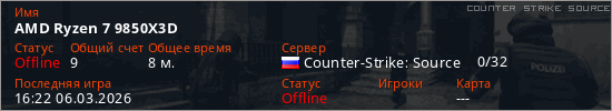 Играет на Counter Strike Source сервере. Страна: РоссияПервый раз замечен 15:47 06.03.2026