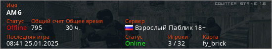 Играет на Counter Strike 1.6 сервере. Страна: РоссияПервый раз замечен 19:58 05.01.2020