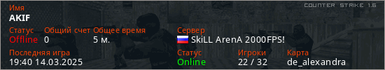 Играет на Counter Strike 1.6 сервере. Страна: РоссияПервый раз замечен 19:31 14.03.2025