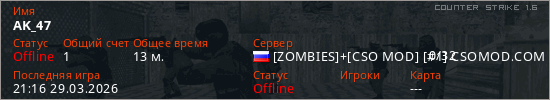 Играет на Counter Strike 1.6 сервере. Страна: РоссияПервый раз замечен 21:17 27.03.2026