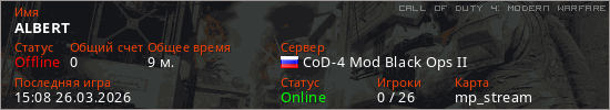Играет на Call of Duty 4: Modern Warfare сервере. Страна: РоссияПервый раз замечен 18:42 22.03.2026