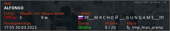 Играет на Counter Strike 1.6 сервере. Страна: РоссияПервый раз замечен 17:47 30.03.2023