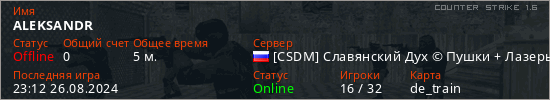 Играет на Counter Strike 1.6 сервере. Страна: РоссияПервый раз замечен 22:56 26.08.2024