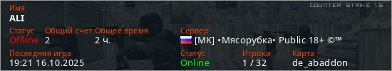 Играет на Counter Strike 1.6 сервере. Страна: РоссияПервый раз замечен 22:04 21.06.2023