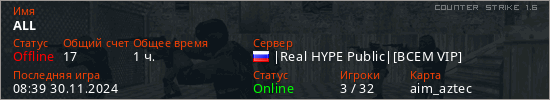 Играет на Counter Strike 1.6 сервере. Страна: РоссияПервый раз замечен 19:02 13.11.2024