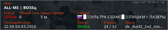 Играет на Counter Strike 1.6 сервере. Страна: РоссияПервый раз замечен 22:34 04.03.2026