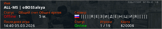 Играет на Counter Strike 1.6 сервере. Страна: РоссияПервый раз замечен 14:34 05.03.2026