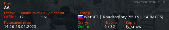 Играет на Counter Strike 1.6 сервере. Страна: РоссияПервый раз замечен 06:49 02.09.2022