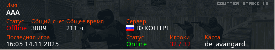 Играет на Counter Strike 1.6 сервере. Страна: РоссияПервый раз замечен 13:11 23.11.2019