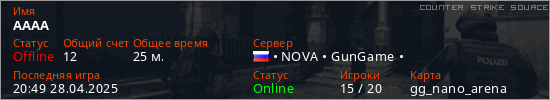 Играет на Counter Strike Source сервере. Страна: РоссияПервый раз замечен 10:59 17.01.2025