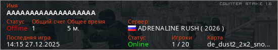 Играет на Counter Strike 1.6 сервере. Страна: РоссияПервый раз замечен 14:12 27.12.2025