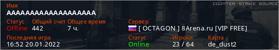 Играет на Counter Strike Source сервере. Страна: РоссияПервый раз замечен 21:12 19.01.2022