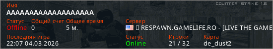 Играет на Counter Strike 1.6 сервере. Страна: СШАПервый раз замечен 22:02 04.03.2026