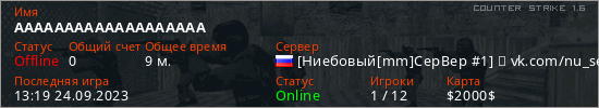 Играет на Counter Strike 1.6 сервере. Страна: РоссияПервый раз замечен 22:45 22.09.2023
