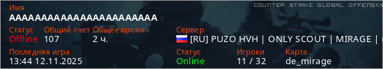 Играет на Counter Strike Global Offensive сервере. Страна: РоссияПервый раз замечен 17:02 12.10.2025