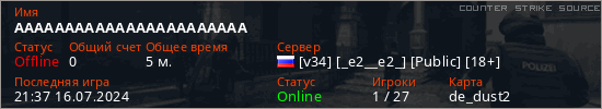 Играет на Counter Strike Source сервере. Страна: РоссияПервый раз замечен 21:35 16.07.2024
