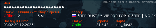 Играет на Counter Strike Global Offensive сервере. Страна: РоссияПервый раз замечен 01:56 20.12.2025