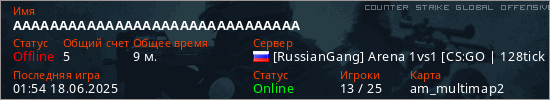 Играет на Counter Strike Global Offensive сервере. Страна: РоссияПервый раз замечен 20:58 03.04.2025