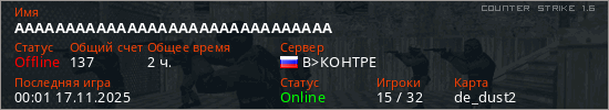 Последний раз был в сети 00:01 17.11.2025 Игрок с таким ником замечен на 29 серверах