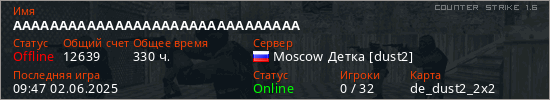 Играет на Counter Strike 1.6 сервере. Страна: РоссияПервый раз замечен 15:36 04.08.2020