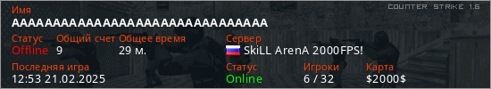 Играет на Counter Strike 1.6 сервере. Страна: РоссияПервый раз замечен 12:01 26.05.2023