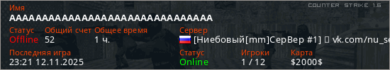 Играет на Counter Strike 1.6 сервере. Страна: РоссияПервый раз замечен 11:56 26.05.2021