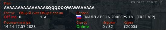 Играет на Counter Strike 1.6 сервере. Страна: РоссияПервый раз замечен 20:32 10.06.2023