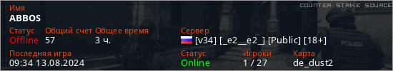 Играет на Counter Strike Source сервере. Страна: РоссияПервый раз замечен 13:28 24.01.2024