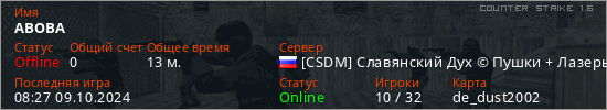 Последний раз был в сети 08:27 09.10.2024 Игрок с таким ником замечен на 35 серверах