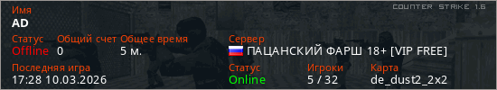 Играет на Counter Strike 1.6 сервере. Страна: РоссияПервый раз замечен 17:25 10.03.2026