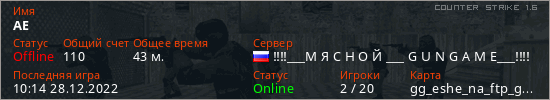 Играет на Counter Strike 1.6 сервере. Страна: РоссияПервый раз замечен 09:33 28.12.2022